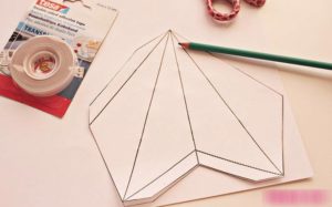 - След това премерете 4 см от ръба на сгънатите части и прокарайте линия до краищата. Изрежете целия излишен материал и ще получите конструкция, която прилича на самолет.